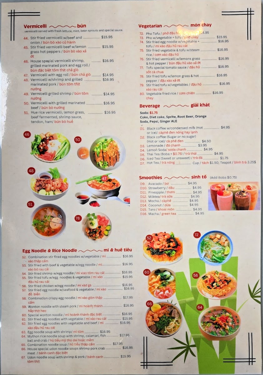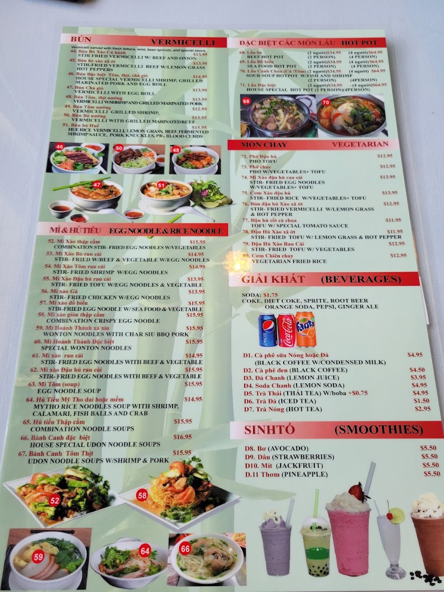 This menu is suited for casual dining occasions including lunch and dinner, offering options for those seeking light meals as well as more substantial traditional Vietnamese dishes. Customers can expect a straightforward ordering experience with dishes that highlight the cuisine’s authentic flavors and ingredients.