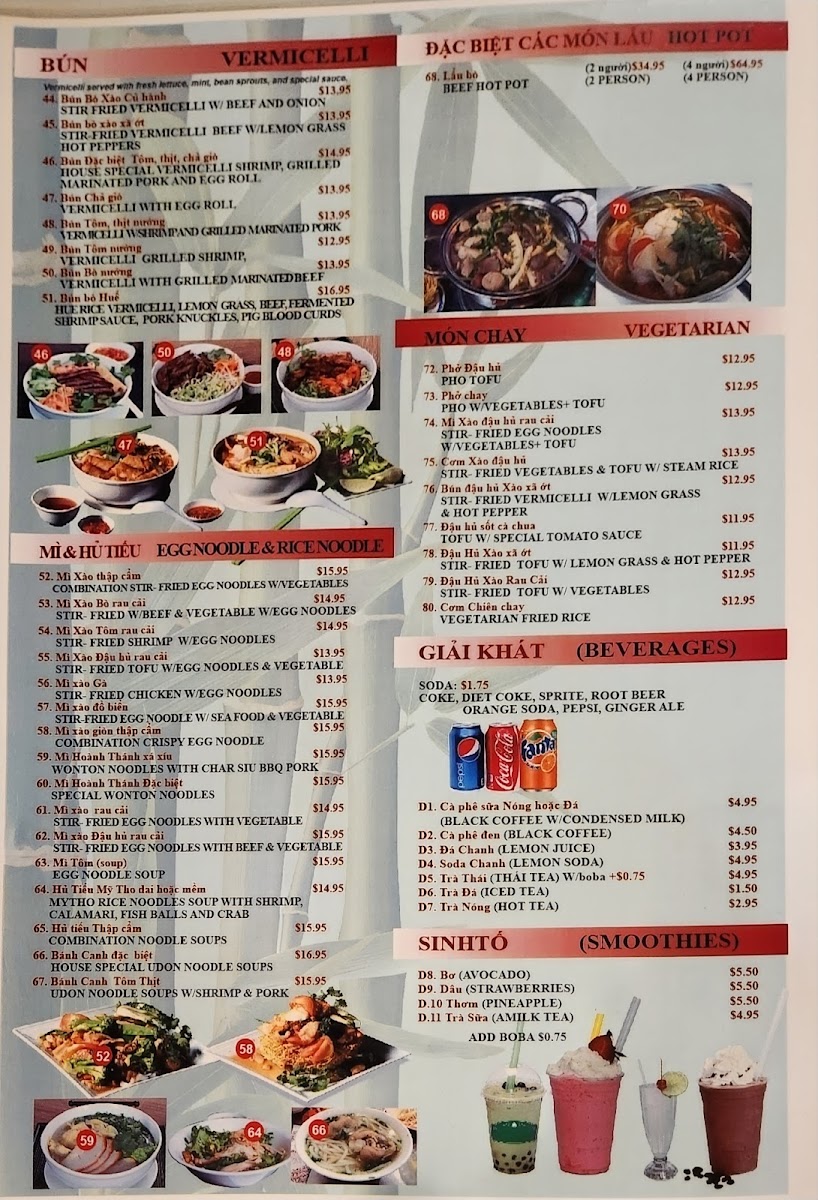 The menu at Super Pho and Grill features a variety of traditional Vietnamese dishes with a focus on pho and other noodle soups, along with rice dishes and beverages. It is organized into several key categories that cater to different meal preferences and times.